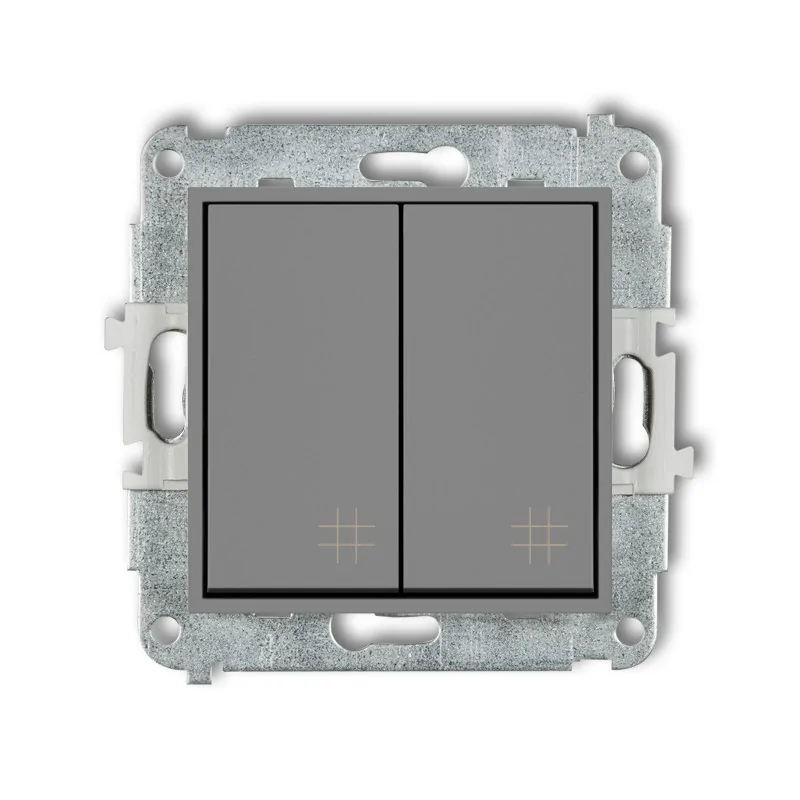 Włącznik krzyżowy podwójny serii ICON marki KARLIK przeznaczony jest do montażu podtynkowego. Produkt sprzedawany jest bez ramki w zestawie i wyposażony został w dwa klawisze w kolorze szarym matowym z piktogramem. Do prawidłowego montażu należy osobno dokupić uniwersalną, standardową ramkę instalacyjną tej samej serii ICON firmy KARLIK. Ramki dostępne są w różnych wersjach kolorystycznych oraz kształtach (okrągły, zaokrąglony, kwadratowy), w krotnościach 1-5. Każdy mechanizm wyposażony jest w zestawie w ramkę pośrednią w kolorze mechanizmu, którą można wymienić. Ramki pośrednie dostępne są w 20 kolorach.