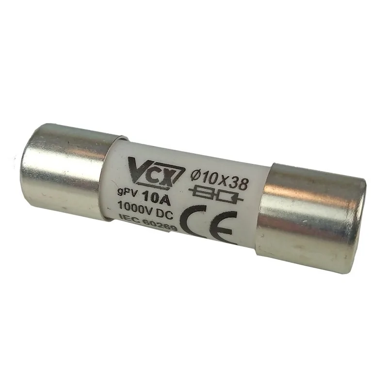 Wkładka bezpiecznikowa PV cylindryczna 10A, przeznaczona do instalacji fotowoltaicznych oraz niskonapięciowych prądu stałego. Bezpiecznik topikowy VCX o wymiarach 10x38 mm, montowany jest w podstawach bezpiecznikowych.