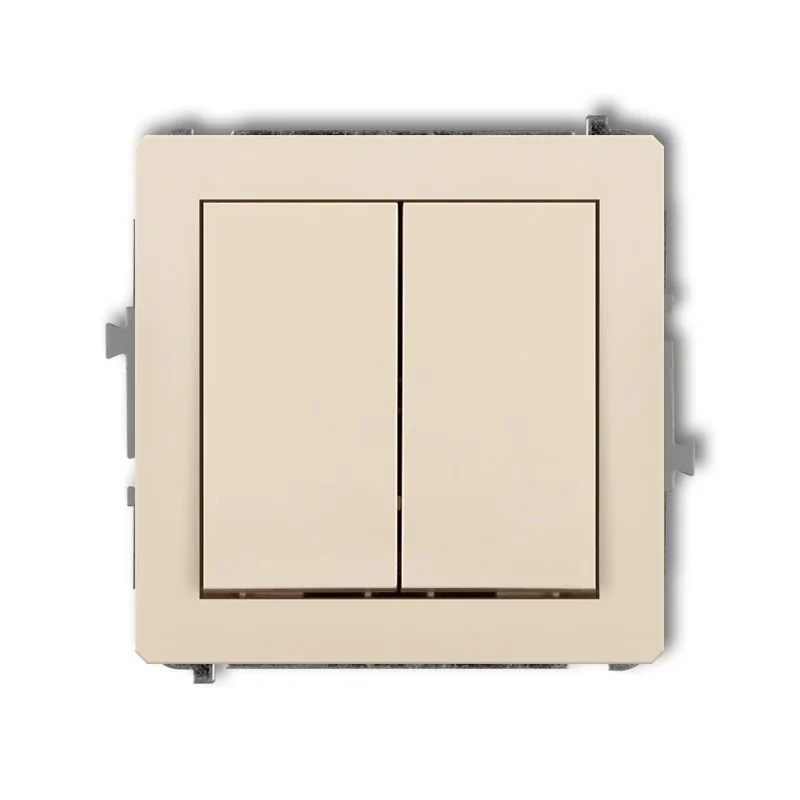 Włącznik zwierny z dwoma klawiszami serii DECO marki KARLK przeznaczone jest do montażu podtynkowego. Produkt działa na zasadzie przycisku dzwonkowego- po naciśnięciu klawisze odbijają. Istnieje możliwość stworzenia wersji z podświetleniem oraz zwiększenia odporności dokupując osobno odpowiedni moduł podświetlający oraz uszczelniacz IP44. Włącznik podwójny zwierny sprzedawany jest bez ramki w zestawie. W serii DECO KARLIK dostępne są ramki w różnych kolorach w krotnościach od 1 do 5. W ofercie znajdują się również ramki wypełniające- niweluje szczelinę pomiędzy ramką standardową, a ścianą (opcja dodatkowa) oraz pośrednie w bogatej kolorystyce, co pozwala na stworzenie własnej kompozycji.