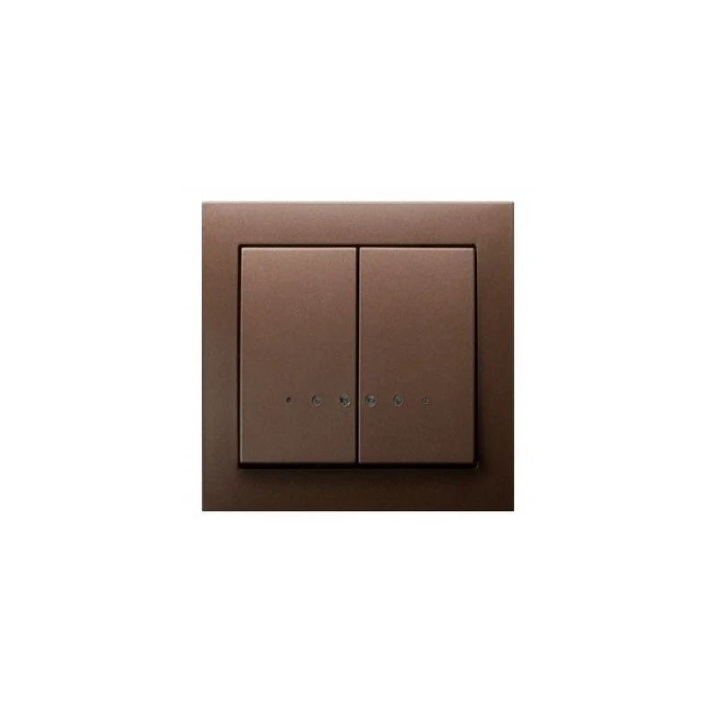 Podwójny włącznik świecznikowy w kolorze brązowym z podświetleniem serii KIER firmy OSPEL, przeznaczony do montażu podtynkowego. Włącznik posiada ramkę w komplecie.