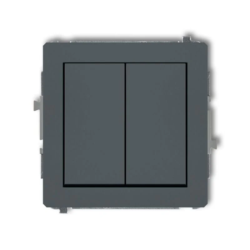 Podwójny włącznik w kolorze grafitowym serii DECO firmy KARLIK, przeznaczony do montażu podtynkowego. Włącznik wymaga dokupienia ramki serii DECO firmy KARLIK.