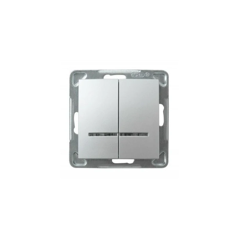 Włącznik świecznikowy z podświetleniem serii IMPRESJA firmy OSPEL w kolorze srebrnym. Włącznik wymaga dokupienia ramki serii IMPRESJA firmy OSPEL.