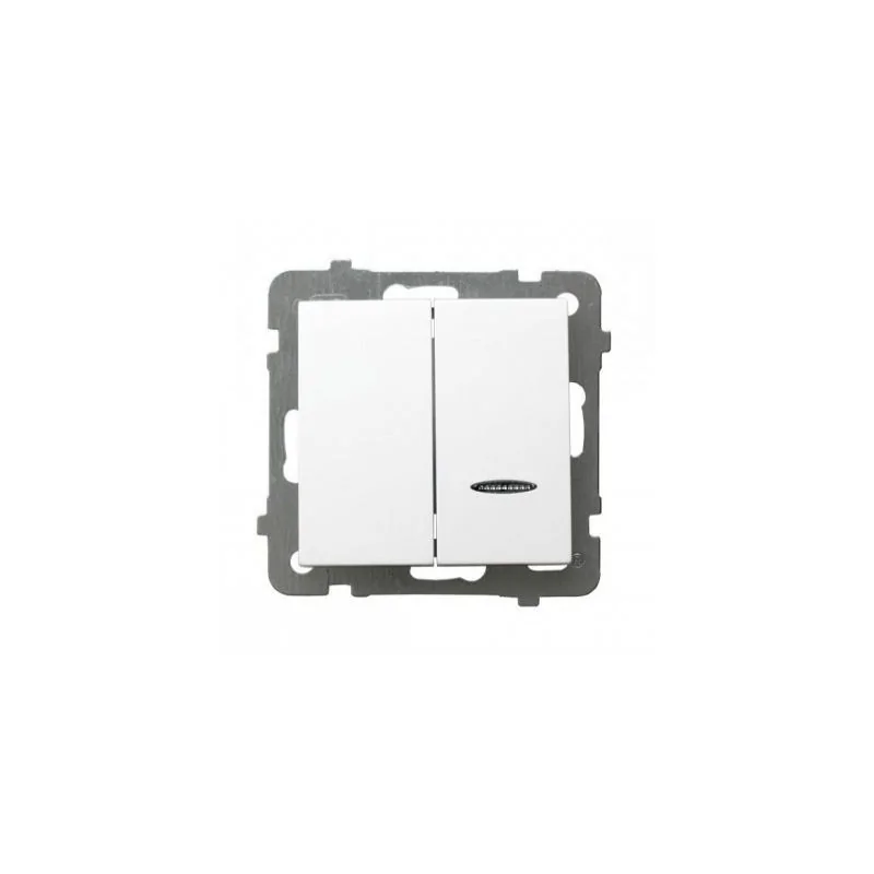 Włącznik podwójny z podświetleniem serii AS firmy OSPEL w kolorze białym, przeznaczony do montażu podtynkowego. Włącznik wymaga dokupienia ramki serii AS firmy OSPEL.