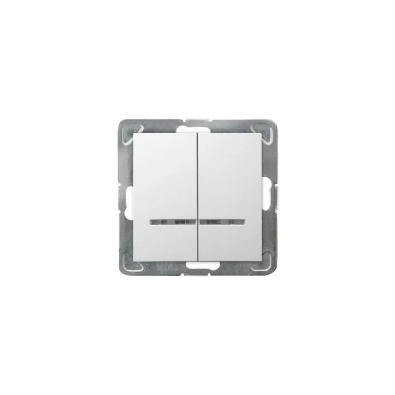 Włącznik dwubiegunowy z podświetleniem serii IMPRESJA firmy OSPEL w kolorze białym, przeznaczony do montażu podtynkowego. Włącznik wymaga dokupienia ramki serii IMPRESJA firmy OSPEL.