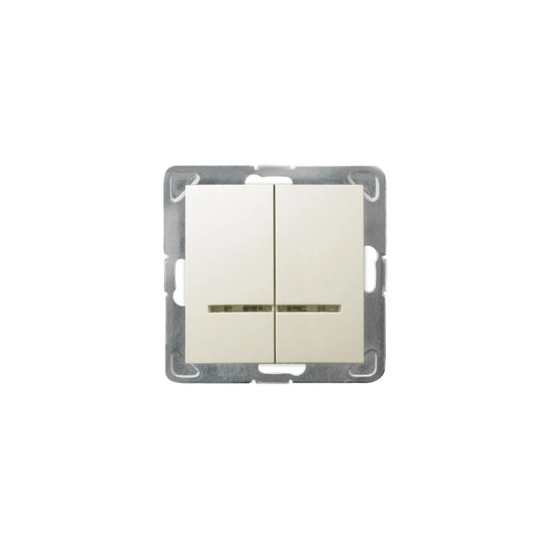 Włącznik podwójny z podświetleniem koloru ECRU serii IMPRESJA firmy OSPEL, sposób montażu podtynkowy. Włącznik wymaga dokupienia ramki serii IMPRESJA firmy OSPEL.
