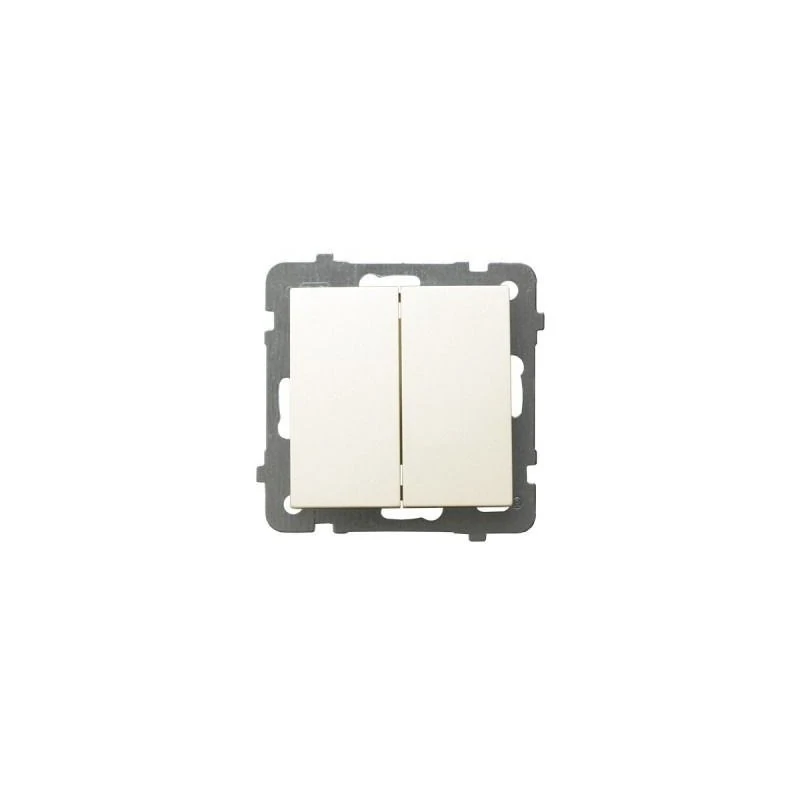 Łącznik podwójny ŁP-2G/m/27 firmy OSPEL w kolorze ECRU wyposażony jest w dwa klawisze. Umożliwia on łączenie dwóch niezależnych obwodów z jednego wspólnego zasilania. Włącznik świecznikowy najczęściej stosowany jest do włączania oświetlenia na kinkietach, żyrandolach podzielonych na dwie strefy, dzięki czemu możemy włączyć oświetlenie tylko na wybranej jego części. Dzięki prostej konstrukcji zacisków z gwintami mechanizm łącznika zwiernego z łatwością zamontujesz w puszce. Łącznik wykonany jest z wysokiej jakości tworzywa, które nadaje mu błyszczącą i odporną na zarysowania powierzchnię. Produkt nie posiada ramki w komplecie. Łącznik ŁP-2G pochodzi z podtynkowej serii AS, która charakteryzuje się klasycznym wyglądem, opartym na kwadracie z mocno zarysowanymi brzegami.