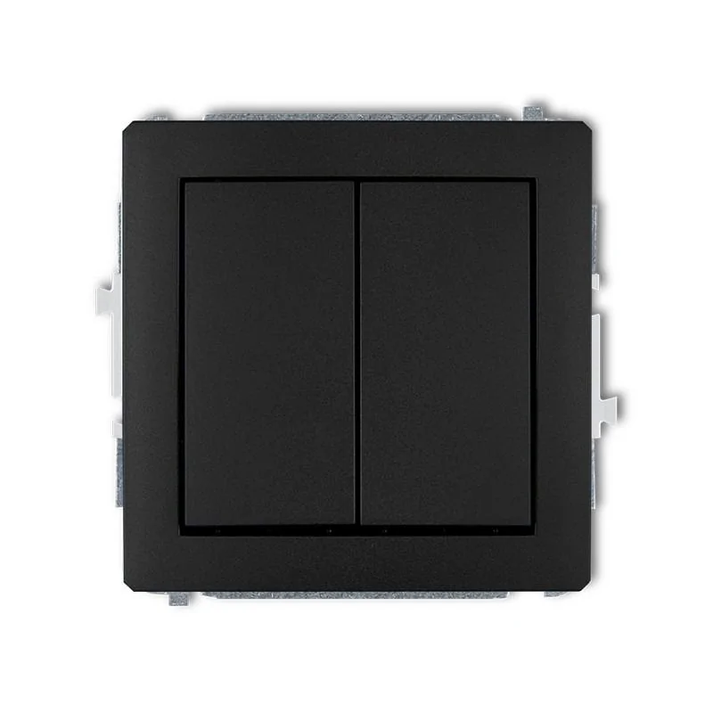 Włącznik zwierny podwójny serii DECO firmy KARLIK w czarnym kolorze, przeznaczony do montażu podtynkowego. Włącznik wymaga dokupienia ramki serii DECO firmy KARLIK.