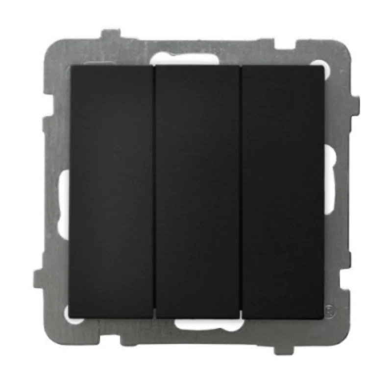 Włącznik potrójny AS OSPEL w eleganckim, czarnym kolorze, przeznaczony do montażu podtynkowego. Należy do serii AS marki OSPEL, łączącej nowoczesny design z wysoką jakością wykonania.