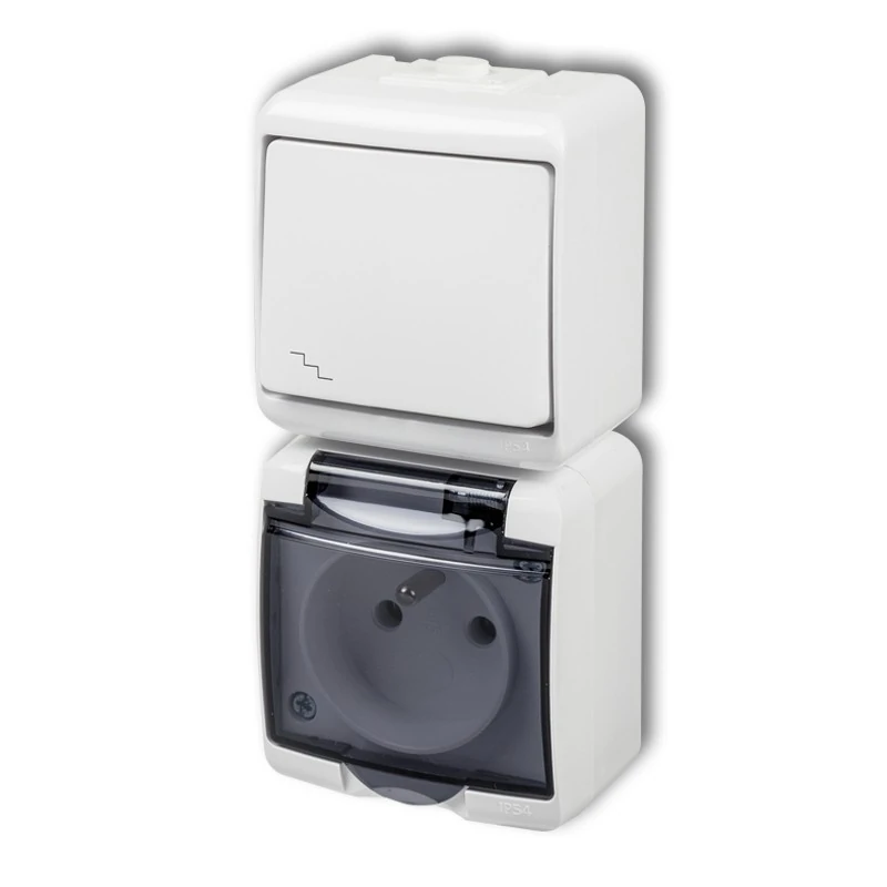 Zestaw WGHP-3d to mix pionowy stanowiący połączenie przełącznika schodowego z gniazdem hermetycznym z transparentną klapką. Komplet przeznaczony jest do montażu natynkowego. Gniazdo w komplecie posiada uziemienie oraz odznacza się bryzgoszczelnością, Takie funkcjonalne połączenia kontaktu z włącznikiem schodowym ułatwia znacznie organizację pracy. Zestawienie WGHP-3 w klasycznej białej barwie przeznaczone jest do montażu natynkowego na ścianach pomieszczeń, w których istnieje zwiększone narażenie na pojawienie się wilgoci lub pyłów. Produkt odznacza się wysoką jakością wykonania - pochodzi z polskiej linii produkcyjnej firmy KARLIK. Gniazdo posiada przesłony styków.