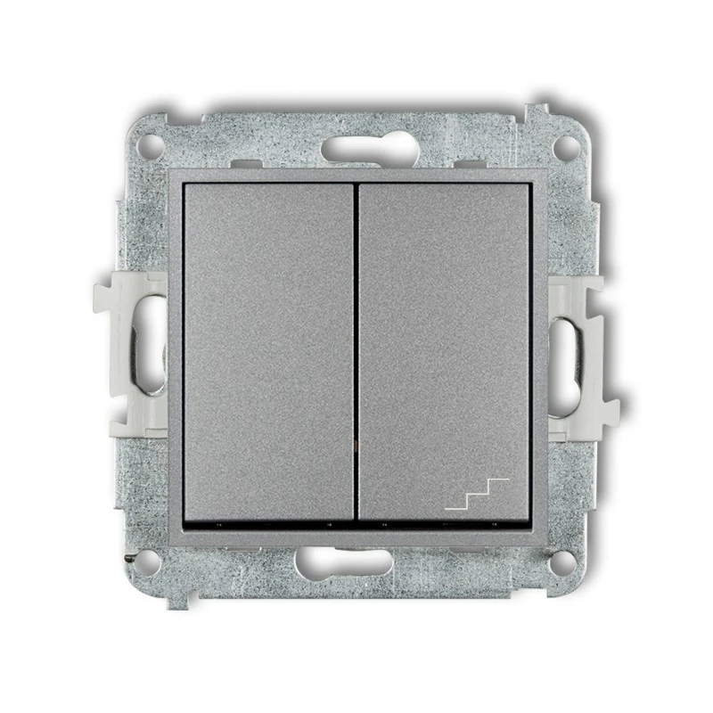 Łącznik jednobiegunowy ze schodowym 7MWP-10.2 wyposażony jest w dwa klawisze oraz posiada osobne zasilanie. Urządzenie pełni złożoną funkcję 2 w 1. Prawy klawisz z piktogramem schodów to łącznik schodowy, a drugi przycisk bez grafiki to łącznik jednobiegunowy. Łacznik wykonany z wysoce odpornego na zarysowania materiału ASA. Klawisz wytrzymuje obciążenia do 10 amperów przy włączaniu i wyłączaniu światła, bez sklejania styków. Wybrany model można uzupełnić o uszczelnienie i podświetlenie dokupując odpowiednie moduły. Produkt dostarczany bez ramki. Model w kolorze srebrny metalik sprzedawany bez ramki.