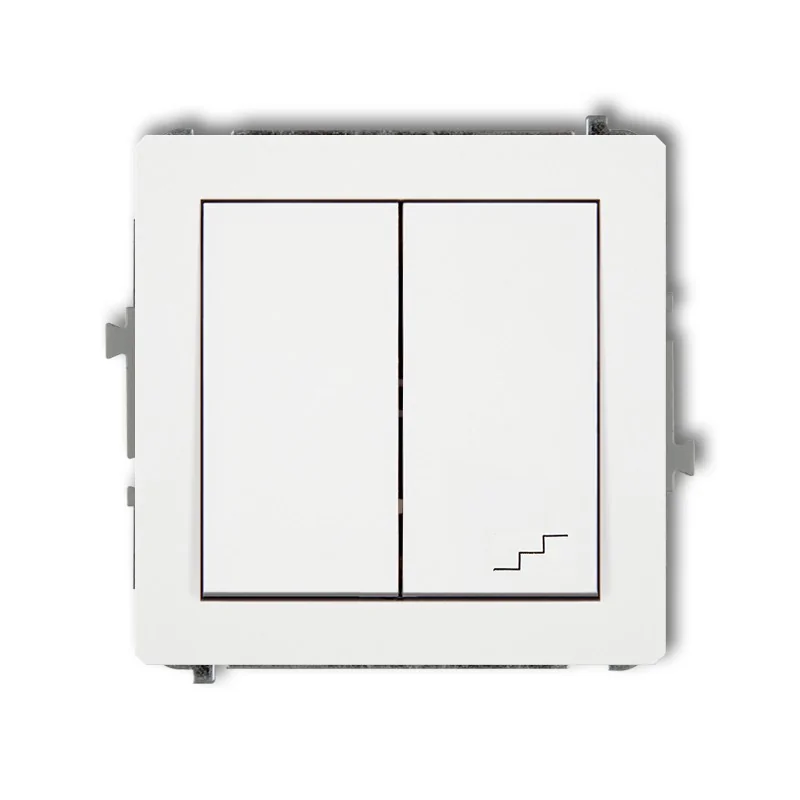 Włącznik jednobiegunowy+schodowy z osobnym zasilaniem serii DECO firmy KARLIK w kolorze białym matowym, przeznaczony do montażu podtynkowego. Włącznik wymaga dokupienia ramki serii DECO firmy KARLIK.