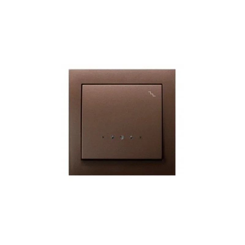 Łącznik schodowy brązowy metalik z podświetleniem ŁP-3WS/52 z jednym klawiszem. Włącznik stosowany jest do montażu na klatkach schodowych , długich korytarzach czy innych ciągach komunikacyjnych w pomieszczeniach. Mechanizm łącznika schodowego należy montować w parach np. na górze i na dole schodów. Posiada piktogram oraz podświetlenie w kolorze pomarańczowym na froncie klawisza, dzięki któremu łatwiej zlokalizować go w ciemności. Włącznik schodowy przeznaczony jest do montażu podtynkowego. Dzięki prostej konstrukcji zacisków z gwintami mechanizm łącznika z łatwością zamontujesz w puszce. Seria produktów KIER firmy OSPEL charakteryzuje się nowoczesnym kompaktowym wyglądem.