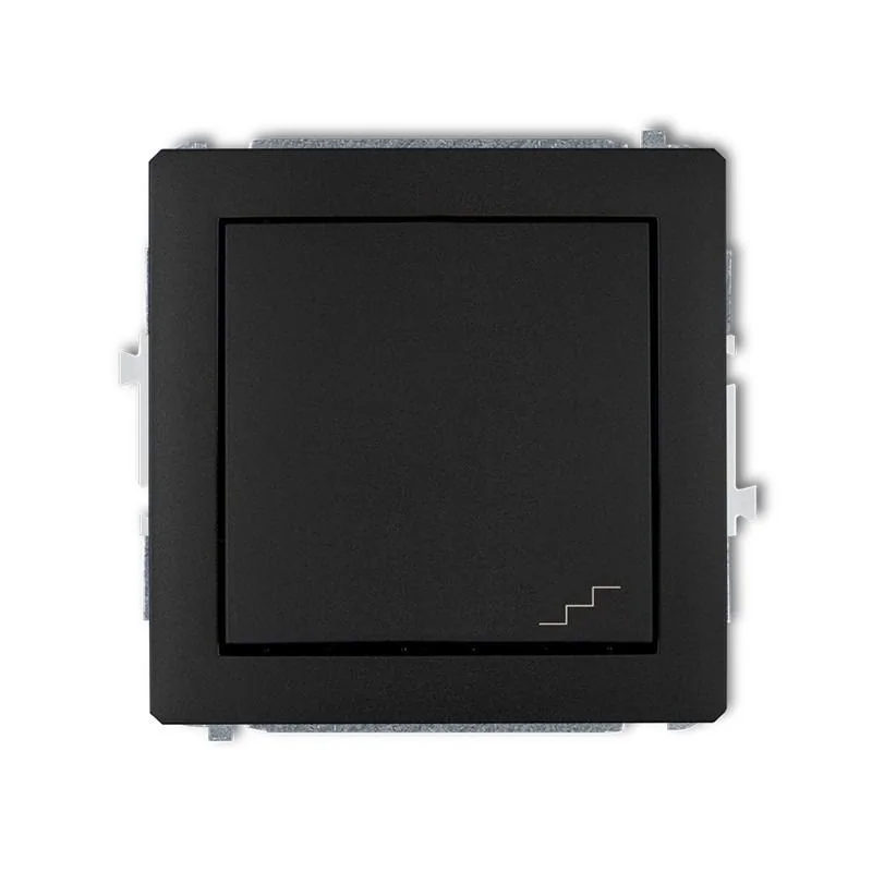 Mechanizm włącznika schodowego w kolorze czarnym serii DECO firmy KARLIK, przeznaczony do montażu podtynkowego. Włącznik wymaga dokupienia ramki serii DECO firmy KARLIK.