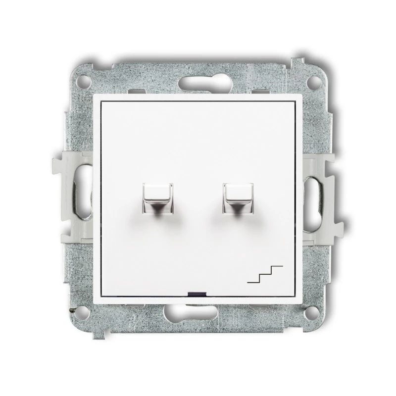 Łącznik jednobiegunowy ze schodowym MWPUS-10.1 wyposażony jest w dwie dźwignie oraz posiada osobne zasilanie. Urządzenie pełni złożoną funkcję 2 w 1. Prawa strona z piktogramem schodów to łącznik schodowy, a druga bez grafiki to łącznik jednobiegunowy. Łacznik wykonany z wysoce odpornego na zarysowania materiału ASA. Klawisz wytrzymuje obciążenia do 10 amperów przy włączaniu i wyłączaniu światła, bez sklejania styków. Wybrany model można uzupełnić o uszczelnienie i podświetlenie dokupując odpowiednie moduły. Produkt dostarczany bez ramki.