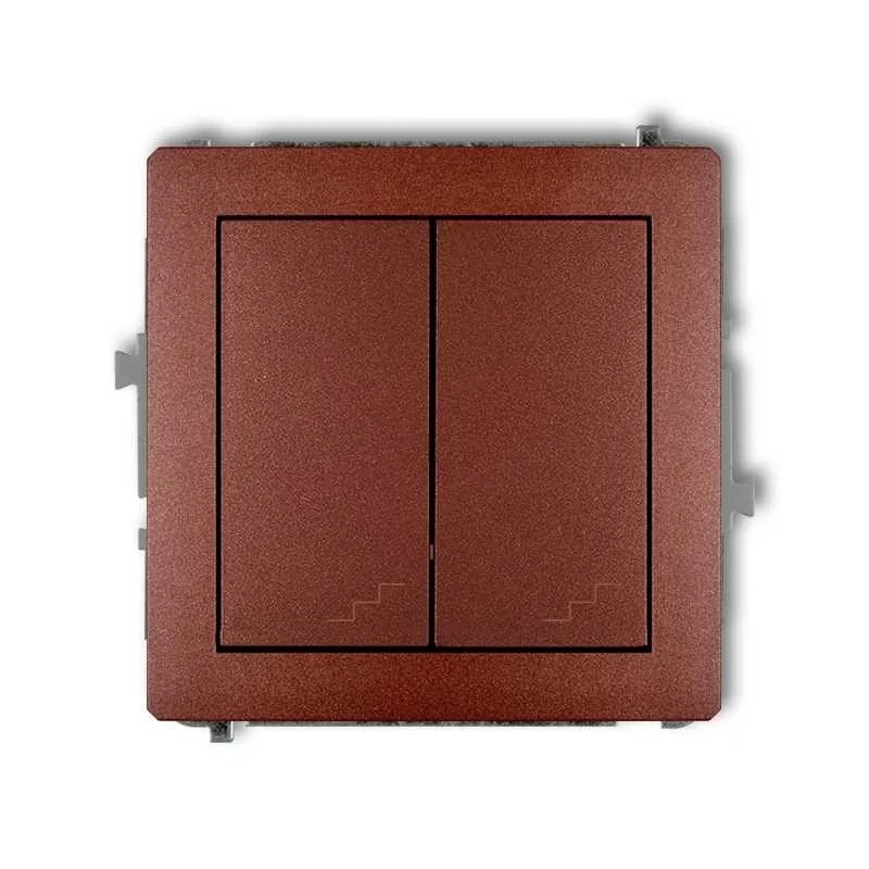 Podwójny włącznik schodowy w kolorze brązowym serii DECO firmy KARLIK, przeznaczony do montażu podtynkowego. Włącznik wymaga dokupienia ramki serii DECO firmy KARLIK.
