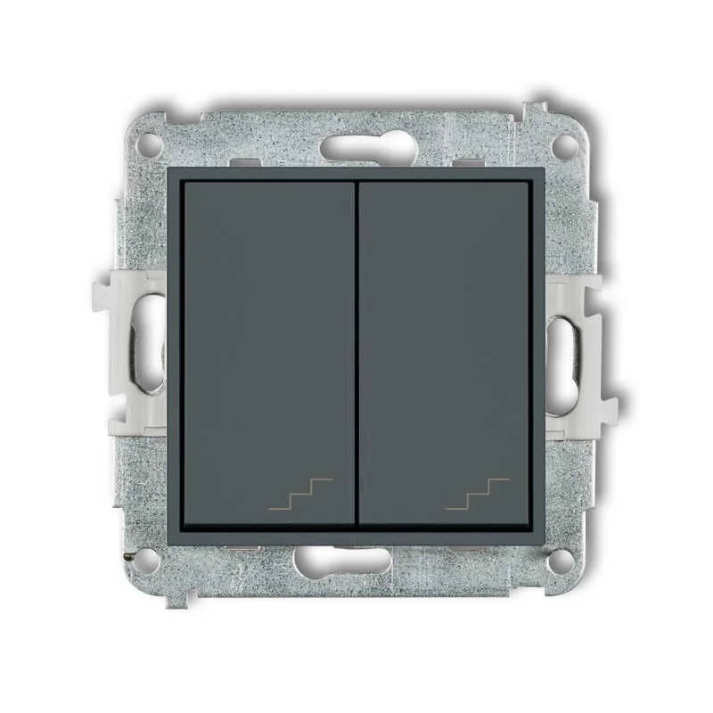 Włącznik schodowy 28MWP-33 serii Deco Mini firmy Karlik sprzedawany jest bez ramki w zestawie i jest w kolorze grafitowego matu. Ramki serii Mini to najmniejsze, dostępne na polskim rynku produkty tego typu. Włącznik schodowy podwójny sprzedawany jest z ramką pośrednią w tym samym kolorze. Ramki pośrednie w innym kolorze niż kolor mechanizmu można kupić osobno. Do włącznika należy dokupić ramkę pojedynczą serii Deco Mini marki Karlik, która dostępna jest w różnych wersjach kolorystycznych. Włączniki serii DECO Mini występują również w wersji podświetlanej. Do włącznika podwójnego schodowego nie można dokupić modułu podświetlającego. Włączniki serii Mini występują również w wersji hermetycznej- należy dokupić osobno uszczelniacz.