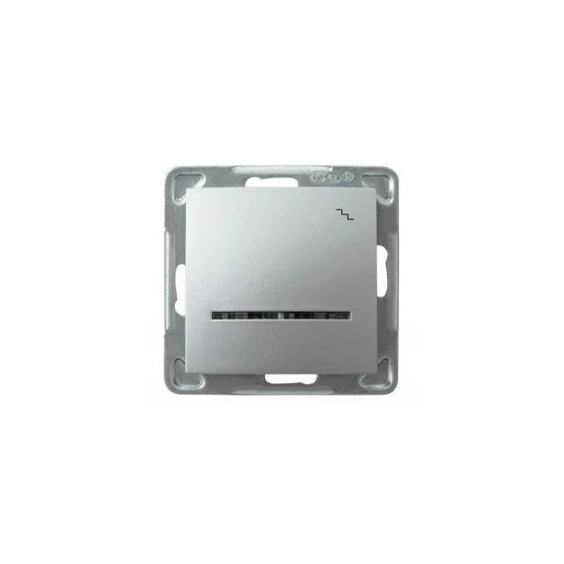 Włącznik schodowy z podświetleniem w kolorze srebrnym serii IMPRESJA firmy OSPEL, sposób montażu: podtynkowy. Włącznik wymaga dokupienia ramki serii IMPRESJA firmy OSPEL.