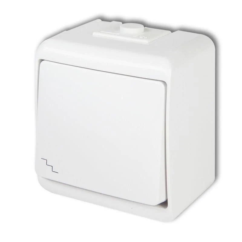 Łącznik schodowy biały IP54 natynkowy serii JUNIOR może być stosowany w pomieszczeniach o zwiększonej wilgotności i narażeniu na kurz i brud. Wyłączniki klatkowe na schody pracują w parach, dzięki temu możesz sterować oświetleniem z dwóch różnych miejsc np. włączyć światło na parterze, a wyłączyć na drugim piętrze.Ten mechanizm sprawdzi się na klatkach schodowych lub korytarzach w hotelach, pensjonatach, szpitalach lub innych lokalizacjach. Wyłącznik schodowy posiada jeden klawisz. Pstryczek do światła przeznaczony jest do montażu natynkowego.