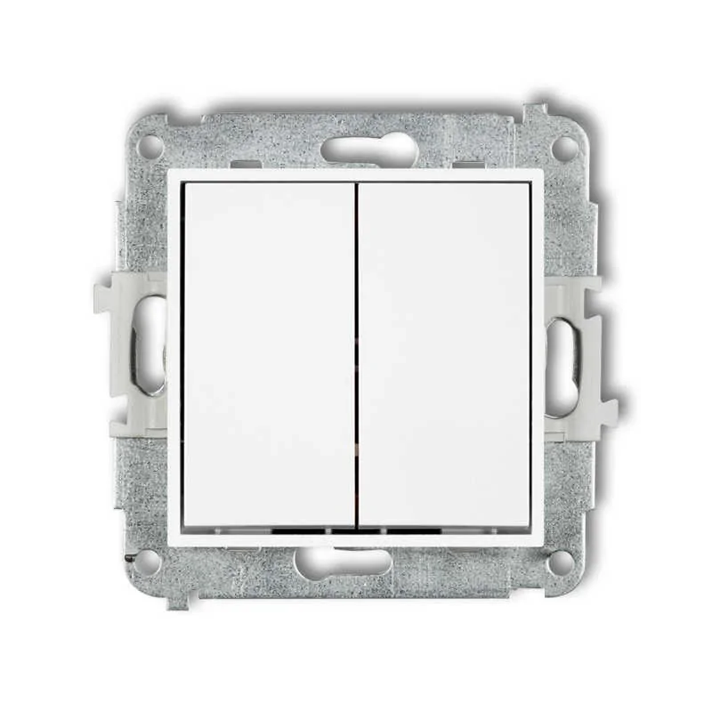 Włącznik schodowy podwójny bez piktogramów MWP-33.1 serii Deco Mini firmy Karlik sprzedawany jest bez ramki w zestawie i jest w kolorze białym. Ramki serii Mini to najmniejsze, dostępne na polskim rynku produkty tego typu. Włącznik schodowy podwójny sprzedawany jest z ramką pośrednią w tym samym kolorze. Ramki pośrednie w innym kolorze niż kolor mechanizmu można kupić osobno. Do włącznika należy dokupić ramkę pojedynczą serii Deco Mini marki Karlik, która dostępna jest w różnych wersjach kolorystycznych. Włączniki serii DECO Mini występują również w wersji podświetlanej. Do włącznika schodowego podwójnego nie można dokupić modułu podświetlająego. Włączniki serii Mini występują również w wersji hermetycznej- należy dokupić osobno uszczelniacz.
