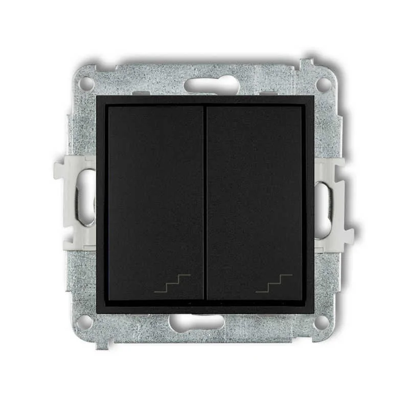 Włącznik schodowy podwójny 12MWP-33 serii Deco Mini firmy Karlik sprzedawany jest bez ramki w zestawie i jest w kolorze czarnego matu. Ramki serii Mini to najmniejsze, dostępne na polskim rynku produkty tego typu. Włącznik schodowy podwójny sprzedawany jest z ramką pośrednią w tym samym kolorze. Ramki pośrednie w innym kolorze niż kolor mechanizmu można kupić osobno. Do włącznika należy dokupić ramkę pojedynczą serii Deco Mini marki Karlik, która dostępna jest w różnych wersjach kolorystycznych. Włączniki serii DECO Mini występują również w wersji podświetlanej- do włącznika podwójnego schodowego nie można dokupić modułu podświetlającego. Włączniki serii Mini występują również w wersji hermetycznej- należy dokupić osobno uszczelniacz.