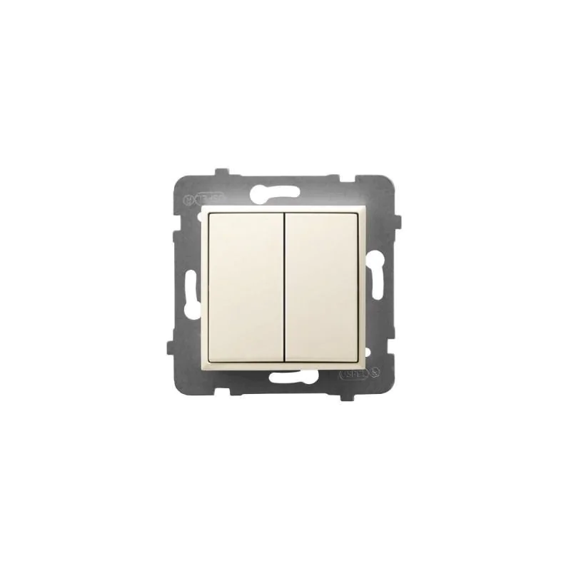 Łącznik schodowy ŁP-10U/m/27 serii ARIA firmy OSPEL przeznaczony jest do montażu podtynkowego oraz sprzedawany jest bez ramki w zestawie. Schodowy łącznik wyposażony jest w dwa klawisze oraz przystosowany jest do użytku wewnętrznego. Do włączników serii ARIA można dokupić wewnętrzne ramki podświetlane dostępne w siedmiu różnych kolorach. Podwójny włącznik schodowy jest w kolorze ECRU i posiada prąd znamionowy równy 10AX.