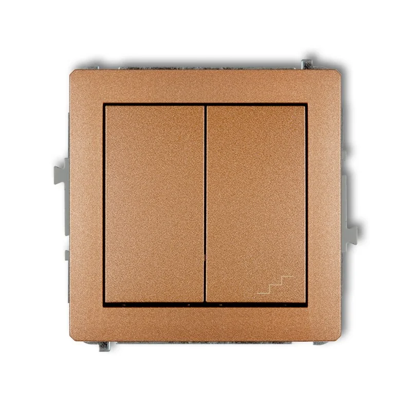Włącznik jednobiegunowy+schodowy z osobnym zasilaniem serii DECO firmy KARLIK w kolorze złotym, przeznaczony jest do montażu podtynkowego. Prawy klawisz z piktogramem schodów to łącznik schodowy, a drugi przycisk to łącznik jednobiegunowy. Włącznik jednobiegunowy ze schodowym sprzedawany jest bez ramki w zestawie. Dostępne są ramki w krotnościach 1-5 w różnych kolorach. W ofercie znajdują się również ramki wypełniające- niweluje szczelinę pomiędzy ramką standardową, a ścianą (opcja dodatkowa) oraz pośrednie w bogatej kolorystyce, co pozwala na stworzenie własnej kompozycji.