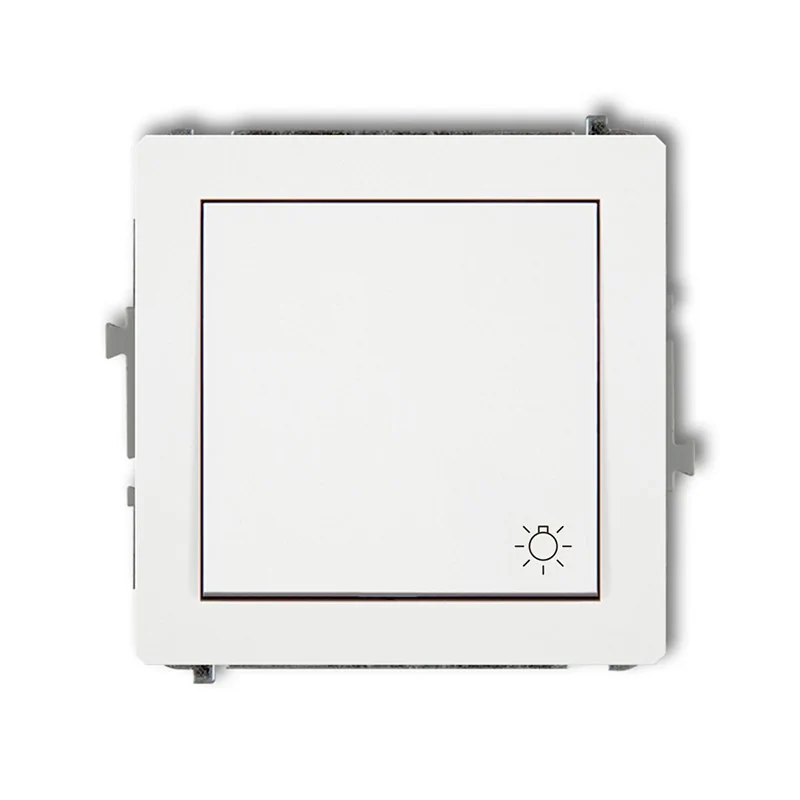 Biały łącznik zwierny światło 25DWP-5 wyposażony jest w jeden klawisz. Służy do podłączenia w obrębie pojedynczego obwodu. DWP-5 jest łącznikiem bistabilnym. Przycisk zwierny światło z serii DECO KARLIK posiada sprężynę. Po puszczeniu przycisku klawisz samoczynnie powraca do pozycji początkowej. W prawym dolnym rogu klawisza znajduje się piktogram z żaróweczką. 25DWP-5 posiada stopień szczelności IP20. Aby podwyższyć stopień ochrony na IP44, należy dokupić ramkę pośrednią do łączników IP44(DRPH) oraz uszczelniacz U-1. Można także dokupić moduł podświetlający- ułatwi to odnalezienie przycisku w ciemności. Model sprawdzi się jako włącznik światła na klatkę schodową lub korytarz w biurze.