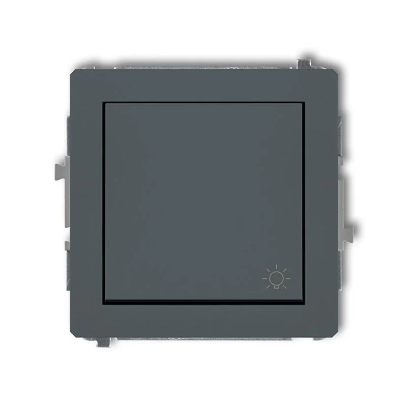 Mechanizm włącznika światło w kolorze grafitowym serii DECO firmy KARLIK, przeznaczony do montażu podtynkowego. Włącznik wymaga dokupienia ramki serii DECO firmy KARLIK.