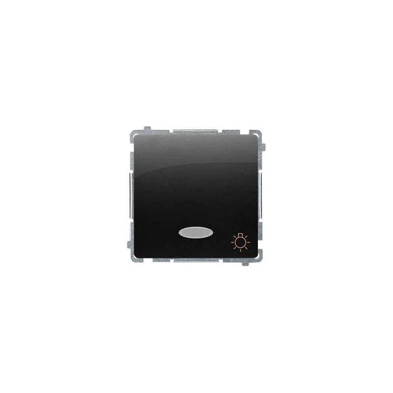 Przycisk ''światło'' z podświetleniem LED serii Simon Basic marki Kontakt-Simon w kolorze czarny mat przeznaczony jest do montażu podtynkowego. Wyposażony został w piktogram żarówki oraz podświetlenie led w kolorze niebieskim. Przycisk wymaga dokupienia standardowej ramki instalacyjnej serii Simon Basic.