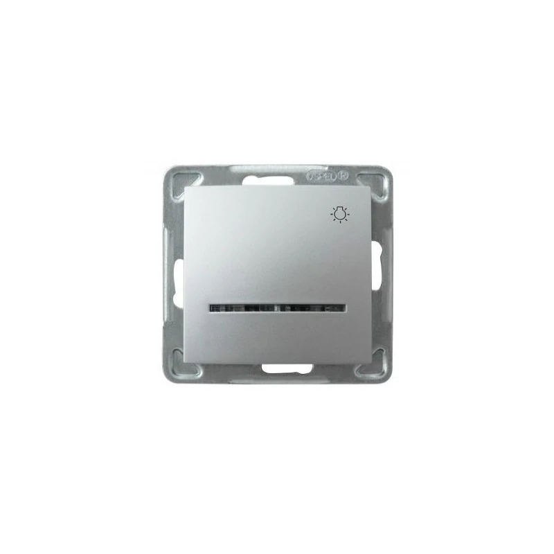 Srebrny włącznik światło z podświetleniem serii IMPRESJA firmy OSPEL, przeznaczony do montażu podtynkowego. Włącznik wymaga dokupienia ramki serii IMPRESJA firmy OSPEL.