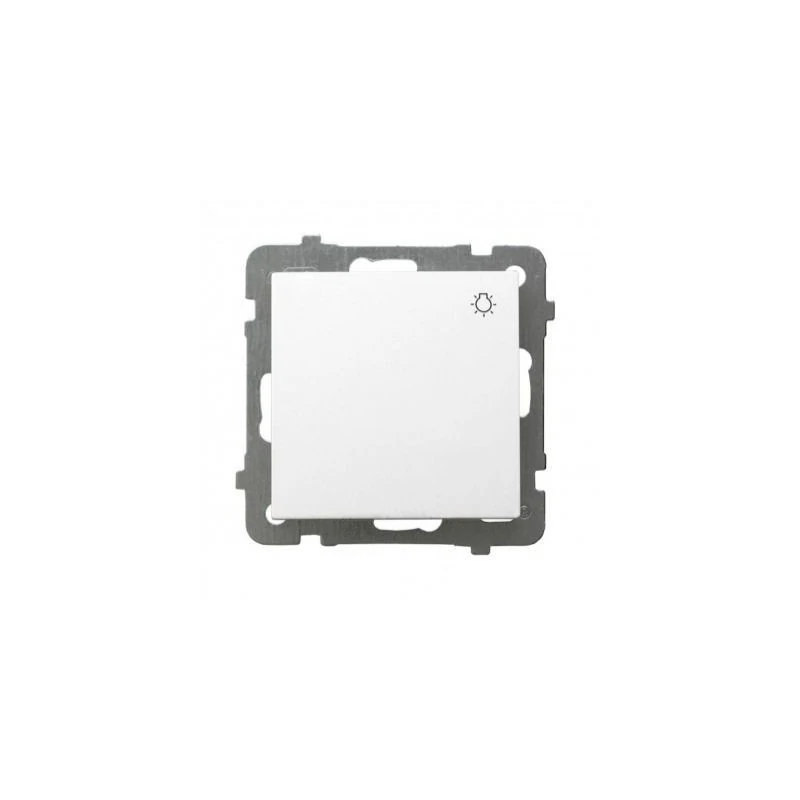 Biały przycisk ŁP-5G/m/00 firmy Ośpel, jest modelem łącznika zwiernego, wyposażony w jeden przycisk typu „światło”. Mechanizm łącznika posiada na klawiszu piktogram żarówki. Łącznik zwierny załącza przekaźnik bistabilny i włącza światło na określony czas, np. na klatkach schodowych. Dzięki prostej konstrukcji zacisków z gwintami przycisk z łatwością zamontujesz w puszce. Łącznik wykonany jest z wysokiej jakości tworzywa, które nadaje mu błyszczącą i odporną na zarysowania powierzchnię. Produkt nie posiada ramki w komplecie. Łącznik ŁP-5G pochodzi z podtynkowej serii AS, która charakteryzuje się klasycznym wyglądem, opartym na kwadracie z mocno zarysowanymi brzegami.