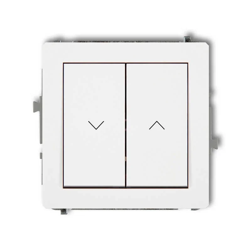 Mechanizm łącznika żaluzjowego DWP-8 z serii DECO KARLIK to łącznik do montażu podtynkowego z dwoma klawiszami w kolorze białym. Na klawiszach umieszczono piktogramy w kształcie strzałek dla ułatwienia sterowania. Łącznik ma za zadanie sterować automatyką rolet. W zależności od rodzaju automatyki posiadanych rolet, może w całości lub częściowo rozwijać i zwijać rolety okienne. DWP-8 umożliwia łączenie w obrębie dwóch oddzielnych obwodów, ale uniemożliwia łączenie ich jednocześnie. Łącznik żaluzjowy podwójny sprzedawany bez ramki.