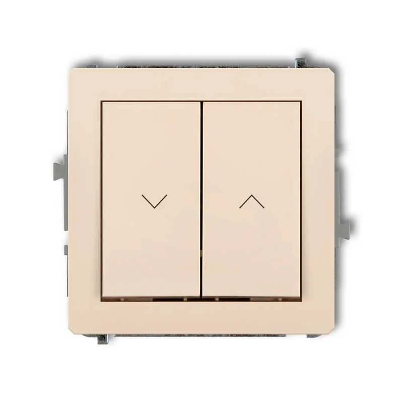 Mechanizm włącznika żaluzjowego serii DECO firmy KARLIK, koloru beżowego, przeznaczony do montażu podtynkowego. Włącznik wymaga dokupienia ramki serii DECO firmy KARLIK.