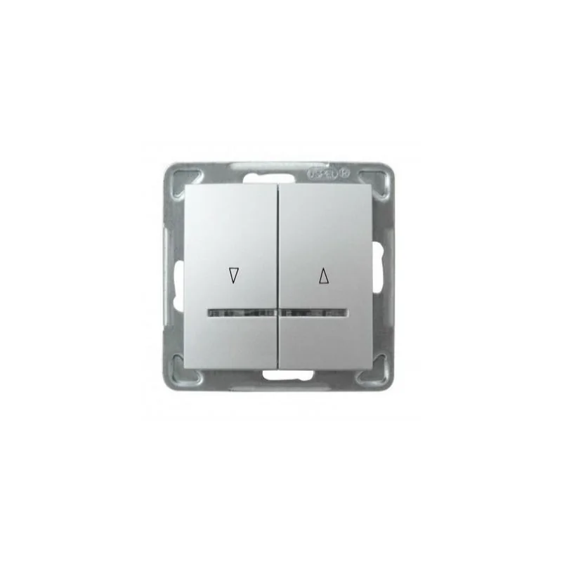 Włącznik żaluzjowy koloru srebrnego z podświetleniem niebieskiem serii IMPRESJA firmy OSPEL, przeznaczony do montażu podtynkowego. Włącznik wymaga dokupienia ramki serii IMPRESJA firmy OSPEL.