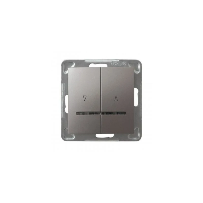 Tytanowy żaluzjowy włącznik z podświetleniem serii IMPRESJA firmy OSPEL, przeznaczony do montażu podtynkowego. Włącznik wymaga dokupienia ramki serii IMPRESJA firmy OSPEL.