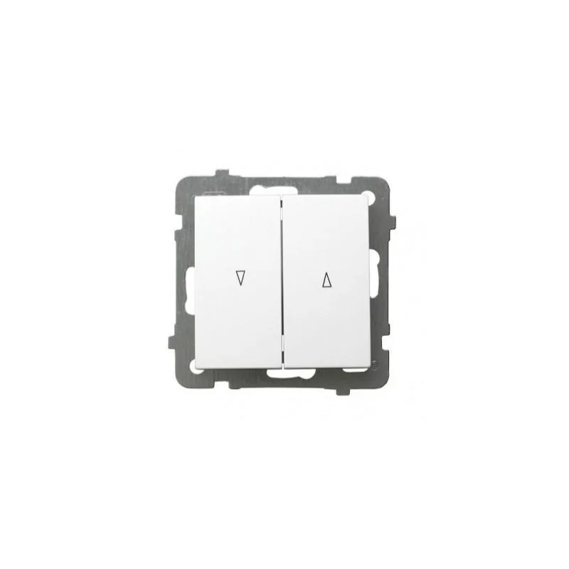 Łącznik żaluzjowy ŁP-7G/m/00 marki OSPEL, w kolorze białym, wyposażony jest w dwa klawisze. Model przystosowany jest do sterowania żaluzjami/roletami - ich podnoszeniem i opuszczaniem. Przycisk żaluzjowy pozwala na łączenie dwóch oddzielnych obwodów, jeden opuszcza żaluzje, drugi je podnosi, ale uniemożliwia ich jednoczesne załączenie. Każdy z klawiszy posiada piktogram obrazujący kierunek ruchu rolety/żaluzji. Łącznik żaluzjowy sprzedawany jest bez ramki zewnętrznej, do kompletu trzeba dokupić ramkę, którą można wybrać z szerokiej oferty kolorystycznej wielokrotnych systemów ramkowych. Łącznik z serii ASP OSPEL montowany jest na zaciski gwintowe i posiada klasę szczelności IP20. Produkty z serii AS charakteryzują się klasycznym wyglądem, opartym na kwadracie z mocno zarysowanymi brzegami.