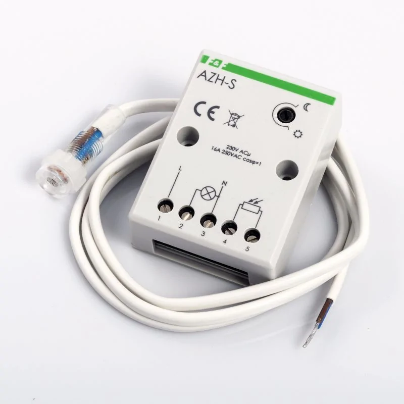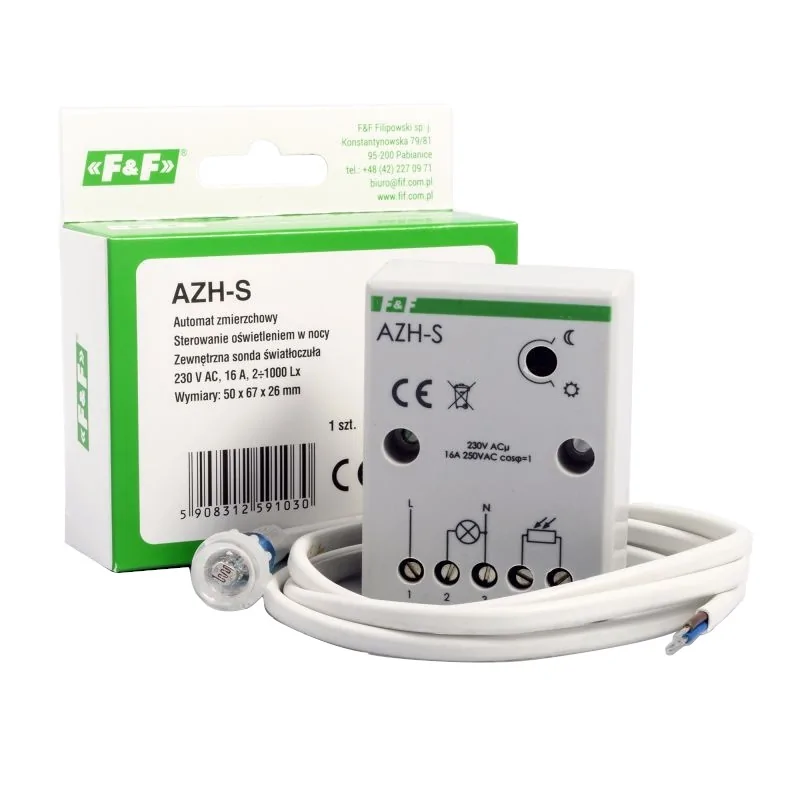 Automat zmierzchowy z zewnętrzną, światłoczułą sondą hermetyczną. Stosowany do sterowania oświetleniem ulic, placów, ogrodów oraz wystaw i reklam. Pod wpływem zmian natężenia światła dziennego załącza oświetlenie o zmierzchu i wyłącza je o świcie. Użytkownik ma możliwość dostosowania do swoich potrzeb pory włączania oświetlenia, za pomocą potencjometru. Automat zmierzchowy posiada układ opóźniający włączanie i wyłączanie oświetlenia, niwelując w ten sposób wpływ zakłóceń (np. atmosferycznych), na pracę automatu. Wyłącznik zmierzchowy AZH-S, to dobre rozwiązanie dla użytkowników gospodarstw domowych jak i przemysłu.