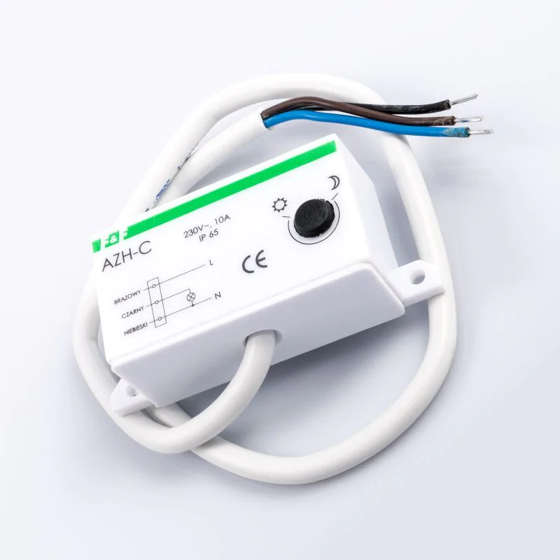 Hermetyczny wyłącznik zmierzchowy AZH-C F&F służy do sterowania źródłami światła lub innymi odbiornikami energii w zależności od natężenia oświetlenia, czyli pory dnia. Automat zmierzchowy IP65 wyłącza oświetlenie np. o świcie i załącza o zmierzchu, pozwalając tym samym na efektywną i oszczędną pracę światłem, w warunkach, kiedy jest to naprawdę konieczne. Automat AZH-C może ułatwiać sterowanie oświetleniem ulic, parkingów, placów miejskich, tablic reklamowych czy oświetleniem parkowym. Wybrany model powinien być zasilany napięciem o wartości 230V. Prąd znamionowy przewidziany dla tego urządzenia to 10A. Wymiary aparatu zmierzchowego wynoszą 81x33x25 mm. Dzięki AZH-C sterowanie załączaniem i wyłączaniem urządzeń, których praca zależy od natężenia oświetlenia może być w łatwy sposób zautomatyzowane. Moduł światłoczuły do sterowania oświetleniem w trybie dzień-noc posiada potencjometr o zakresie regulacji od 2 do 1000 luxów. Aparat posiada zabezpieczenie na wypadek chwilowych zmian natężenia.