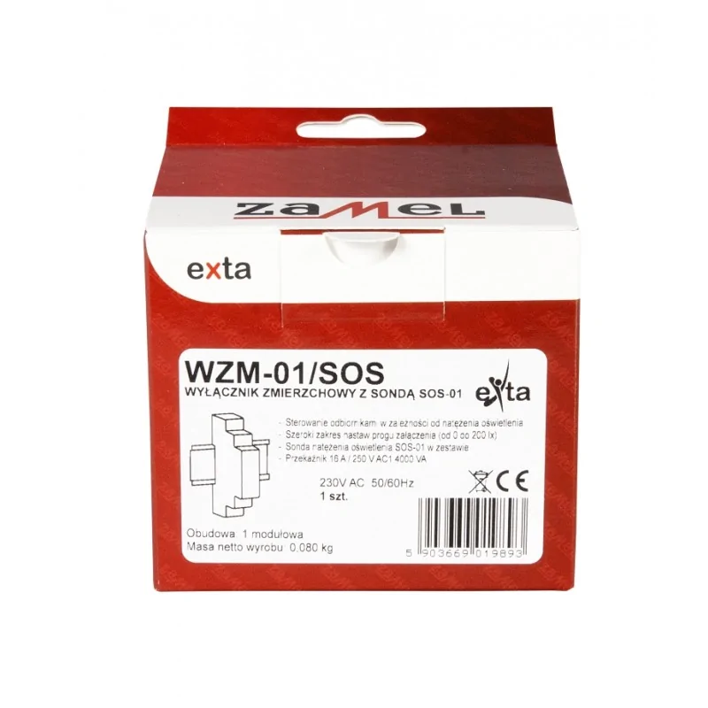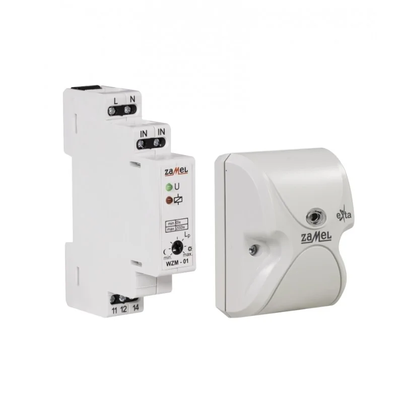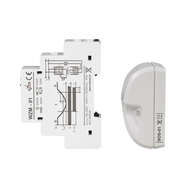 Wyłącznik zmierzchowy WZM-01/SOS marki ZAMEL, służy do sterowania urządzeniami oświetleniowymi lub innymi odbiornikami energii w zależności od natężenia oświetlenia. Układ załącza oświetlenie o zmierzchu i wyłącza o świcie. Próg załączenia może być płynnie nastawiony przez użytkownika. Układ jest odporny na krótkotrwałe zmiany natężenia oświetlenia co gwarantuje niezawodność pracy. Zewnętrzna sonda natężenia oświetlenia SOS-01 (w komplecie) przekazuje sygnał do wyłącznika zmierzchowego WZM-01. Przewód przyłączeniowy sondy o długości maksymalnej 50m umożliwia umieszczenie jej w dogodnych miejscach.