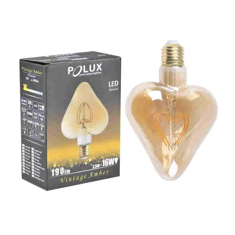 Żarówka dekoracyjna LED VINTAGE AMBER firmy POLUX to źródło światła o ciekawym kształcie serca. Idealnie będzie pasować w lampach z odsłoniętym źródłem światła. Źarówka LED pełni głównie funkcję dekoracyjną i świeci ciepłą barwą światła (bursztynowa) o temperaturze 2000K W środku żarówki w kształcie serca znajdują się ozdobne filamenty, widoczne przez jej klosz. Dekoracyjna żarówka LED świeci z mocą 2,5W (odpowiednik 16W). Żarówka została wyposażona w trzonek E27, a jej strumień świetlny jest równy 190 lumenów. Przybliżony czas trwałości to około 25000h oraz 12500 cykli włączeń i wyłączeń.