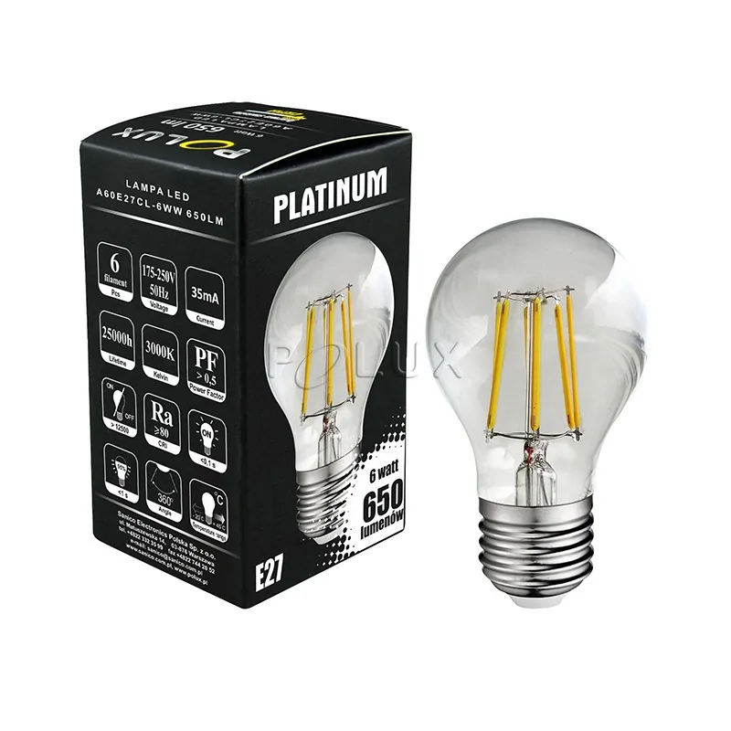 Żarówka LED dekoracyjna firmy POLUX została wyposażona w przeźroczysty klosz., w którym znajdują ozdobne filmenty. Źródło światła LED działa z mocą 6W, a jego odpowiednikiem jest tradycyjna żarówka o mocy 50W. Żarówka posiada tradycyjny trzonek typu E27. Strumień świetlny produktu jest równy 650 lumenów, a jego barwa światła wynosi 3000K (ciepła biała). Żarówka dekoracyjna LED rozsyła światło pod kątem 320°, a jej przybliżony czas trwałości to około 25000h oraz 12500 cykli włączeń i wyłączeń.