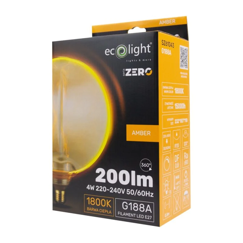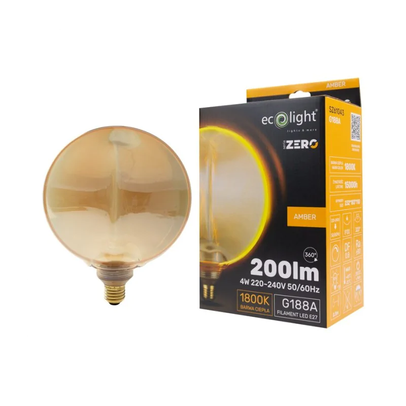 Żarówka LED SERIA ZERO 4W 200lm E27 G188 Amber to eleganckie i energooszczędne rozwiązanie, które łączy funkcjonalność z estetyką. Dzięki zastosowaniu bursztynowego szkła, emituje bardzo ciepłe i przytulne światło, które doskonale nadaje się do tworzenia nastrojowego oświetlenia w salonie, sypialni czy restauracjach. Jej dekoracyjny wygląd sprawia, że świetnie komponuje się z nowoczesnymi i klasycznymi wnętrzami.