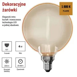 Żarówka LED to eleganckie i energooszczędne rozwiązanie, które łączy funkcjonalność z estetyką. Dzięki zastosowaniu bursztynowego szkła, emituje bardzo ciepłe i przytulne światło, które doskonale nadaje się do tworzenia nastrojowego oświetlenia w salonie, sypialni czy restauracjach. Jej dekoracyjny wygląd sprawia, że świetnie komponuje się z nowoczesnymi i klasycznymi wnętrzami.