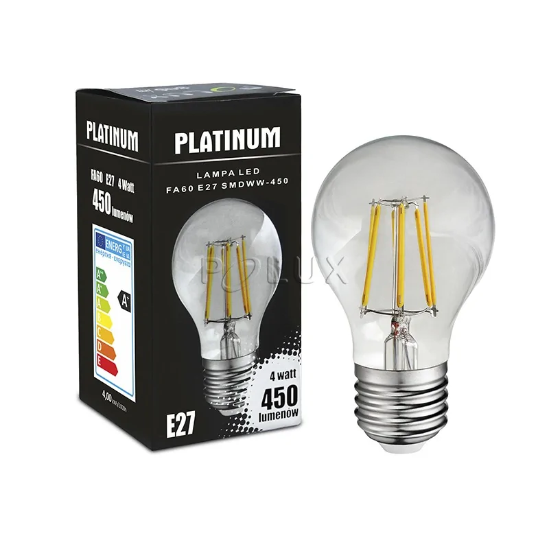 Żarówka LED dekoracyjna firmy POLUX jest wyposażona w przeźroczysty klosz. Produkt posiada ozdobne filamenty, które widoczne są przez szkło. Źródło światła LED działa z mocą 4W, a jego odpowiednikiem jest tradycyjna żarówka o mocy 35W. Żarówka posiada tradycyjny trzonek typu E27. Strumień świetlny produktu jest równy 450 lumenów, a jego barwa światła wynosi 3000K (ciepła biała). Żarówka dekoracyjna LED rozsyła światło pod kątem 320°, a jej przybliżony czas trwałości to około 25000h oraz 12500 cykli włączeń i wyłączeń.