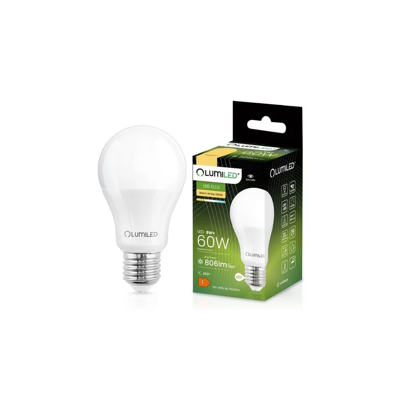 Żarówka LED E27 8W marki LUMILED to energooszczędne źródło światła zachowujące do 90% energii w porównaniu z tradycyjnymi żarówkami. Prezentowane źródło światła działa do 15000 godzin emitując ciepłe białe światło 3000K o mocy strumienia świetlnego 806 lm. Szeroki 260-stopniowy kąt rozsyłu światłości zapewnia doskonałą widoczność w całym pomieszczeniu. Żarówka LED E27 8W należy do klasy energetycznej F (stara A+). Zastosowana przetwornica CCD w żarówce LED sprawia, że żarówka jest odporna na spadki i wzrosty napięcia w sieci. Światło nie migocze, ani nie drży. Przetwornica CCD sprawia, że żarówka jest bezawaryjna przez długi czas. Model dostępny również w wersji neutralnej.