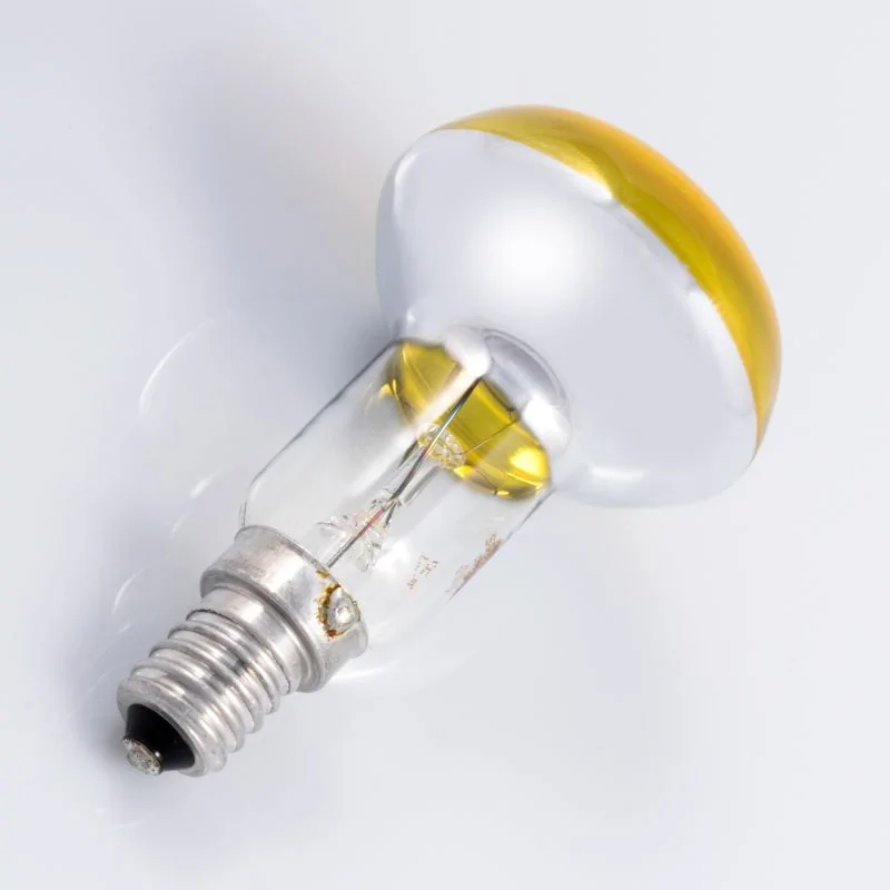 Żarówka reflektorowa z odbłyśnikiem firmy Philips o żółtej barwie emitowanego światła posiada kształt bańki typ żarówki (LoV) w kształcie grzyba, jak w starych żarówkach R50. Lampa żarowa, o klasie energetycznej E o tradycyjnej mocy 40W, przeznaczona jest do napięcia sieciowego 230V, jak żarówki starego typu. Żarówka z reflektorem o gwincie Edisona E14,dawniej stosowana jako klasyczna żarówka. Żółty reflektor teraz ma idealne zastosowanie do podkreślania elementów wnętrz w dyskotekach, barach, piwnicach kawiarnianych, witrynach sklepowych. Doskonała do akcentowania przedmiotów, dzięki 30° kątowi padania światła koncentrycznego skierowanego na wybraną przestrzeń lub przedmiot. Dostępne reflektorki w kolorach czerwonym, żółtym, zielonym i niebieskim. Istnieje możliwość ściemniania tej żarówki wolframowej.