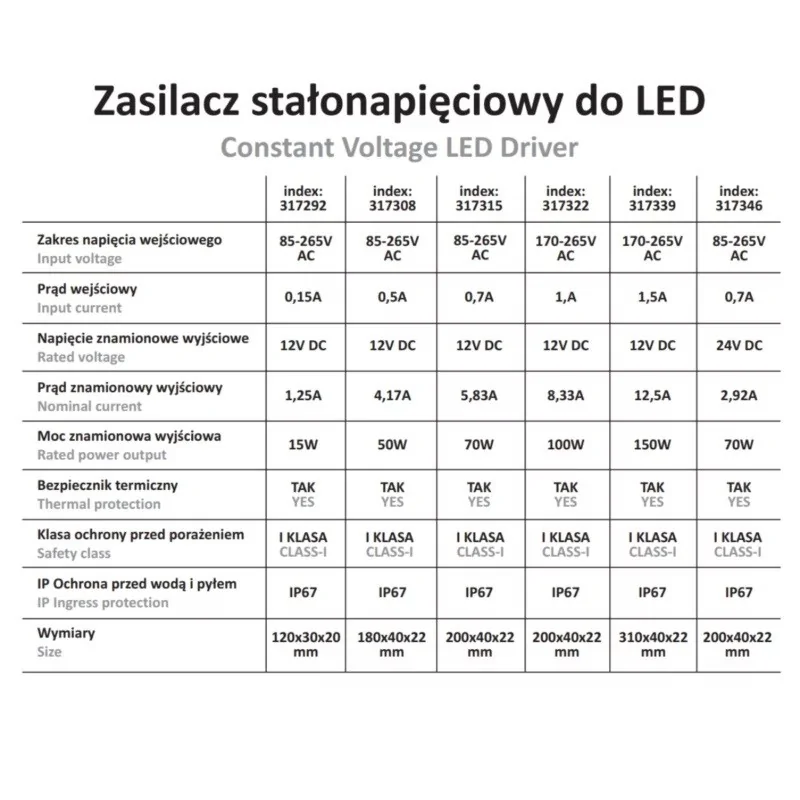 Stałonapięciowy zasilacz LED 317322 marki POLUX-GOLDLUX, możemy zastosować do pojedynczych diod, taśm LED, żarówek czy modułów. Cechuje się napięciem wejściowym niezależnym od dopuszczalnego obciążenia - napięcie zasilania to 24V. Zasilacz LED przystosowany do użytku wewnątrz lub na zewnątrz - stopień odporność IP67, gwarantuje odporność na mróz i deszcz. Produkt wykonany został z metalu i objęty jest gwarancję producenta. Zasilacz posiada zabezpieczenia zwarciowe, przeciążeniowe oraz napięciowe.