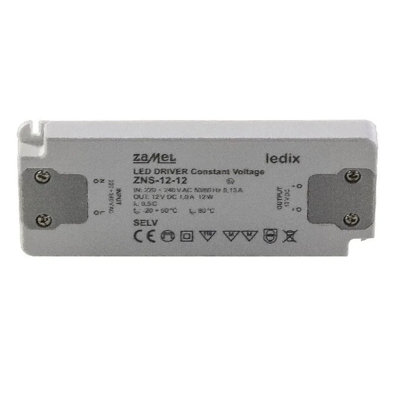 Zasilacz do ledów ZAMEL ZNS-12-12 to zasilacz impulsowy o stabilizacji napięciowej 12 V DC. Transformator do oświetlenia ledowego przeznaczony jest do montażu natynkowego, zarówno w pozycji pionowej, jak i poziomej. Zasilacz ZAMEL o modułowej konstrukcji to produkt bezpieczny, posiadający zabezpieczenia przeciwzwarciowe oraz przeciążeniowe. Zasilacze z serii ZNS cechują się wysoką efektywnością oraz niskim poborem mocy w trybie czuwania. Dzieki temu są rozwiązaniem niezwykle energooszczędnym i ekonomicznym. Zasilacz spełnia wymagania norm zharmonizowanych. Ze względu na swoje gabarty idealnie nadaje się do montażu w domowych instalacjach led min. w meblach oraz sufitach podwieszanych. Dzięki niemu sprawnie rozświetlisz taśmami led witrynki meblowe, przestrzeń obok telewizora, lustra czy delikatnie zaakcentujesz doświetlenie wybranych miejsc w pokoju czy salonie sufitowym oświetleniem led.