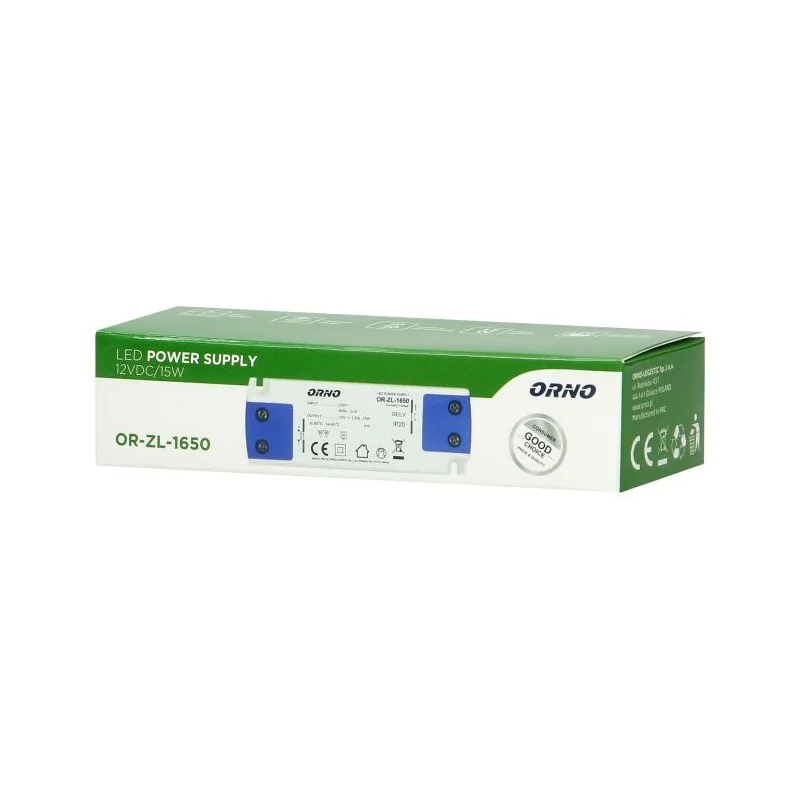 Zasilacz płaski o napięciu 12V DC i maksymalnym obciążeniu 15W. Produkt marki ORNO, służy do zasilania oświetlenia LED, w suchym otoczeniu. Obudowa wykonana została z tworzywa sztucznego. Zasilacz posiada wejściowe i wyjściowe zaciski przyłączeniowe. Sprzedawany jest bez okablowania. Wysokość 16,5mm, natomiast szerokość to 103mm. Produkt objęty gwarancją producenta.